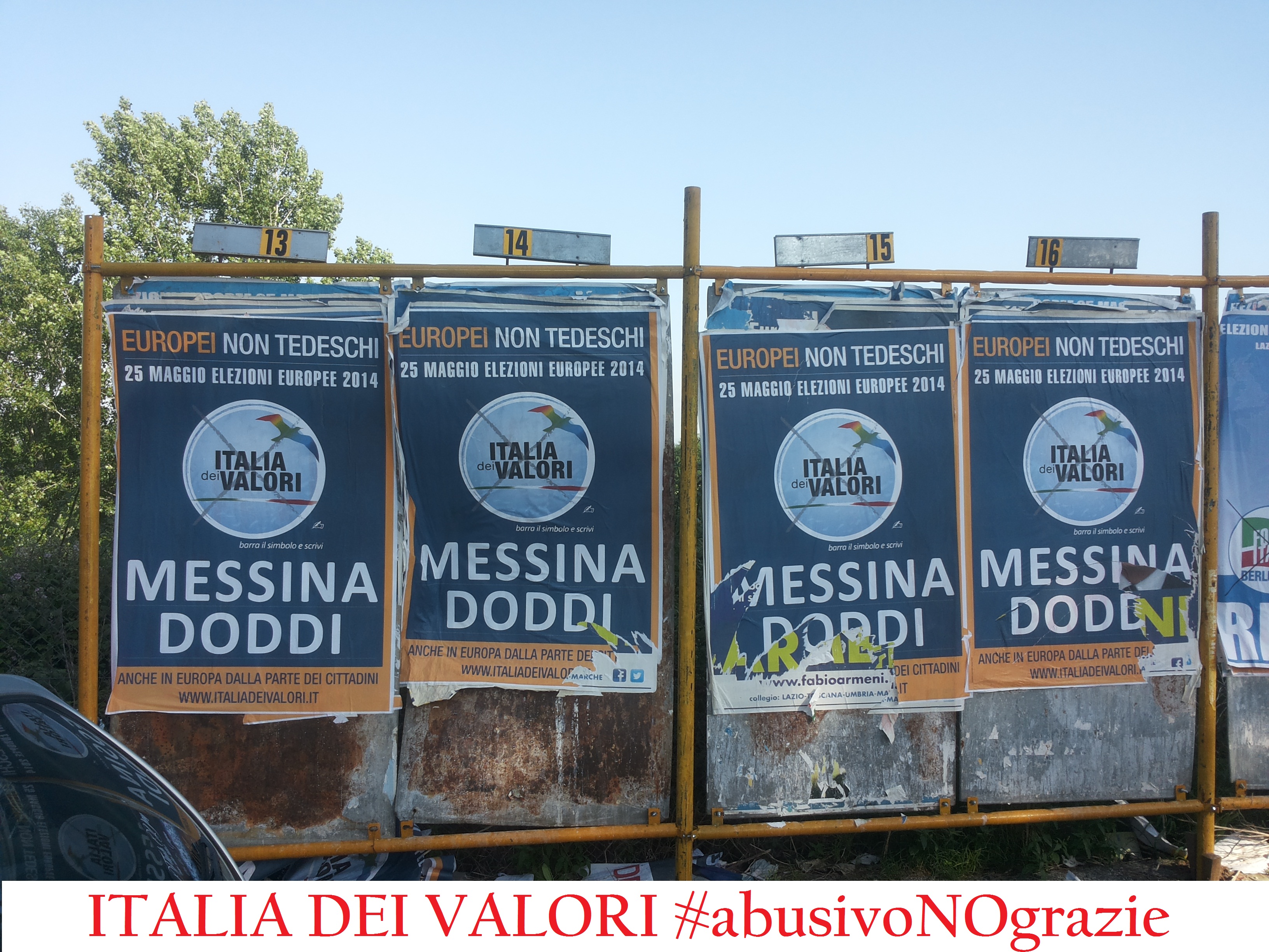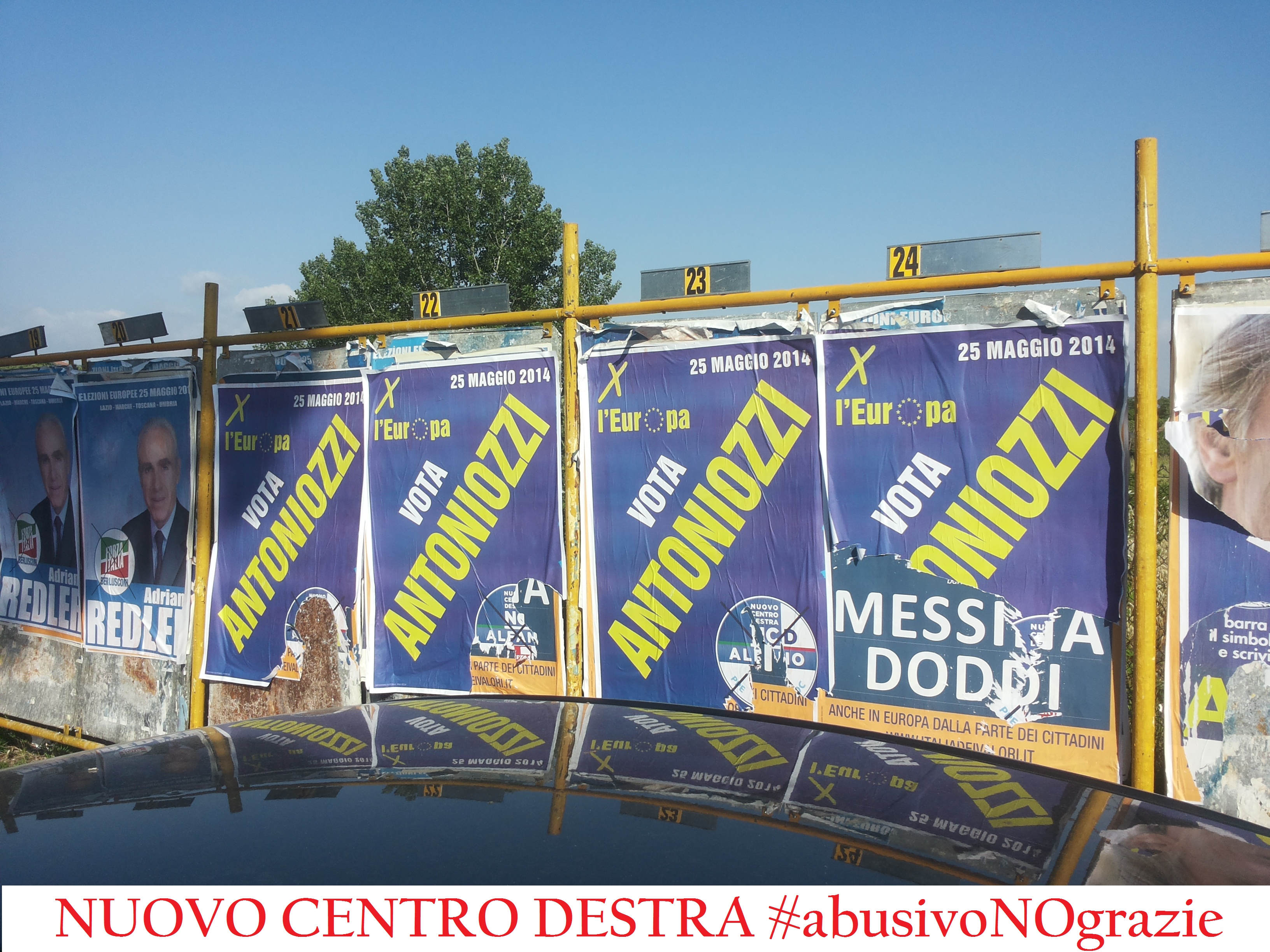 I manifesti abusivi sono un fenomeno che riguarda Forza Italia, Partito Democratico, Fratelli d’Italia, L’altra Europa con Tsipras, Nuovo Centro Destra, Italia dei Valori. Tutti questi partiti politici, per evitare di pagare le multe, condoneranno i loro abusi, come hanno sempre fatto, e di conseguenza sposeranno la politica della tolleranza verso l’illegalità dell’attacchinaggio.
