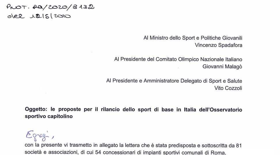 La lettera, che ho trasmesso per conto dell’Osservatorio ai massimi organi di governo sportivo nazionale, è stata predisposta dai referenti dei Concessionari e sottoscritta, in meno di 24 ore, da 81 società e associazioni, di cui 54 Concessionari di impianti sportivi comunali. Penso che si tratti di un record storico per la Capitale: non credo siano mai stati prodotti documenti così partecipati in materia sportiva.
